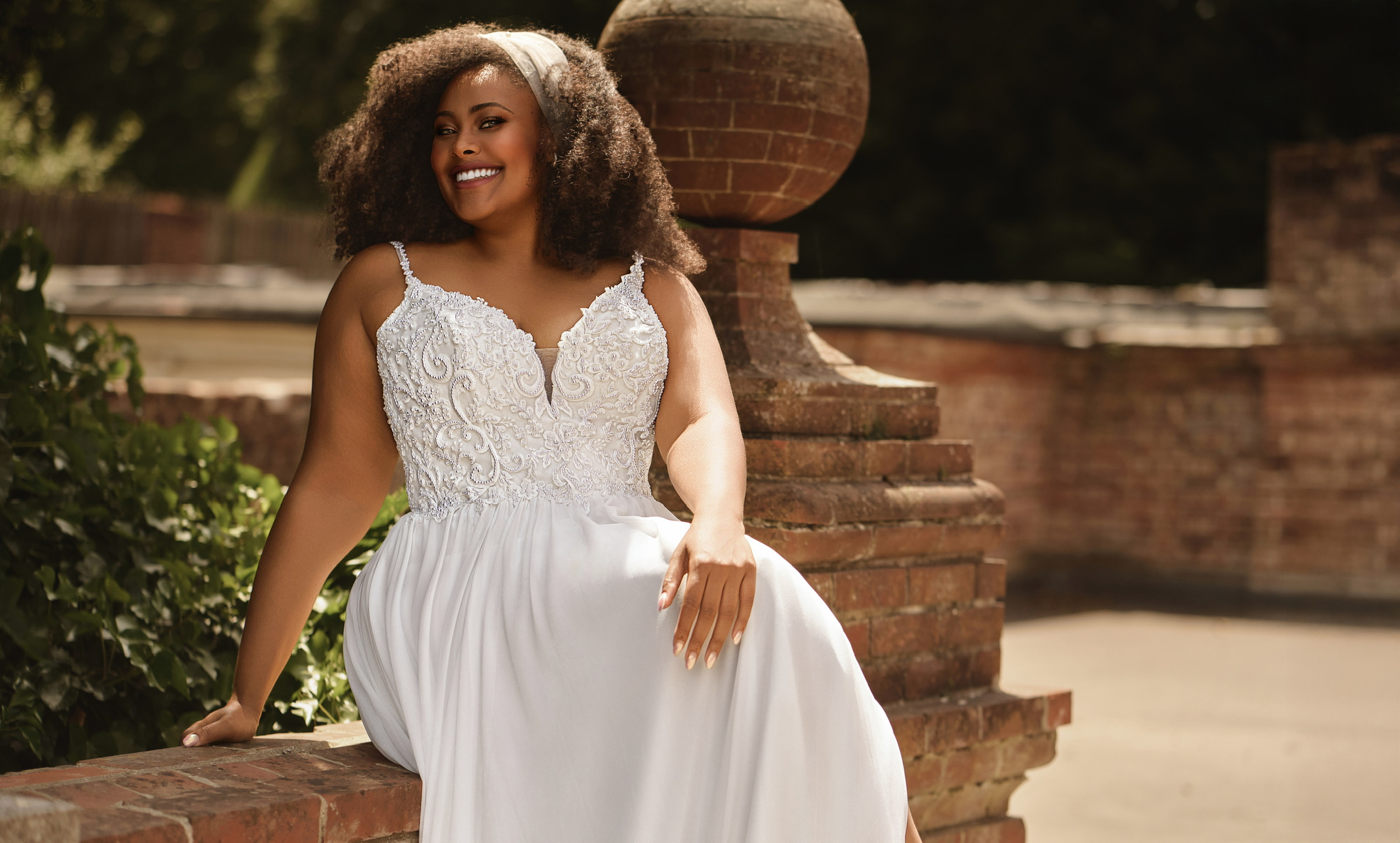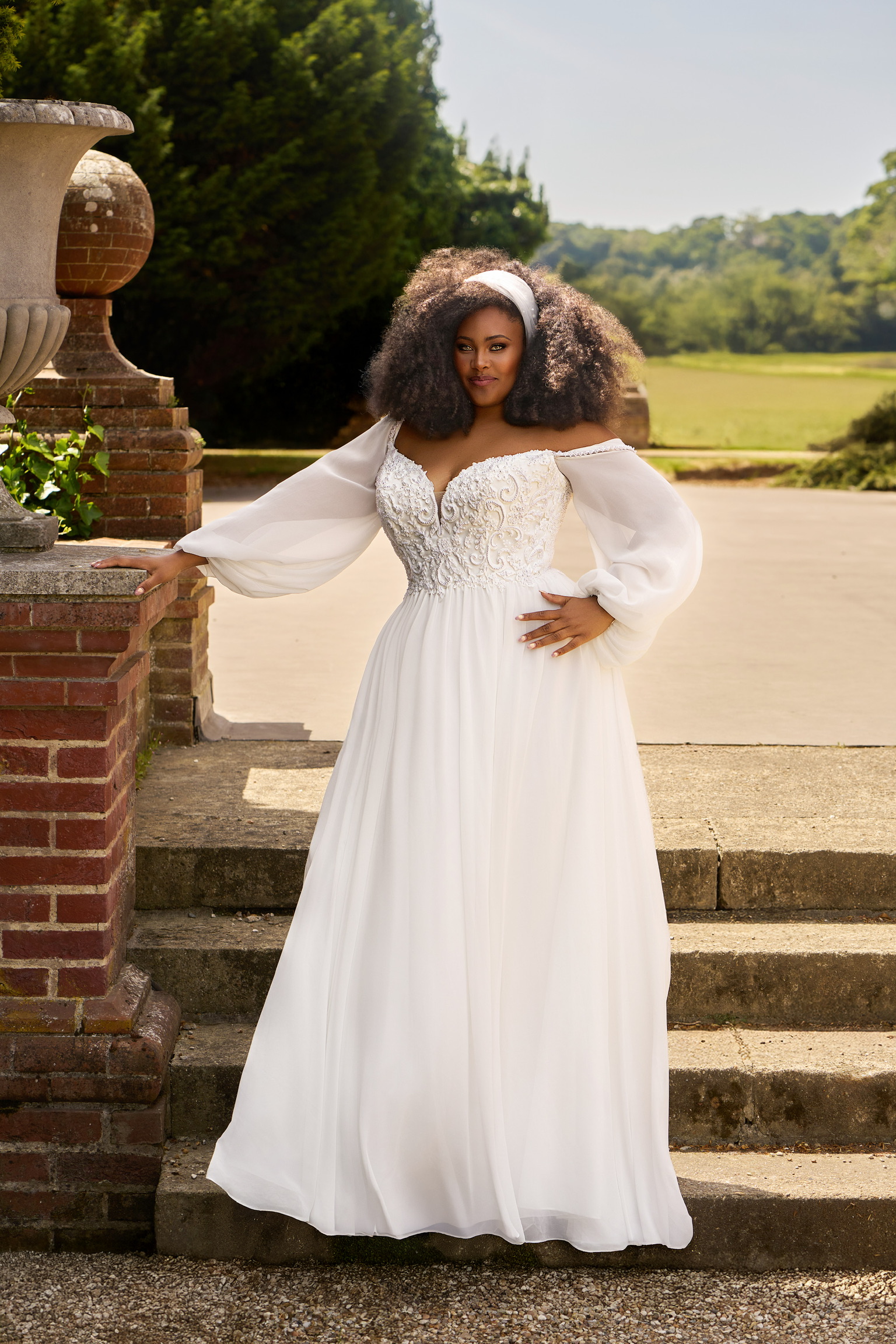 Beaded pearls on a patterned bodice complemented by sparkly spaghetti straps that can be worn on or off shoulder. The chiffon skirt gently flares from your natural waist and creates a floaty chapel train. The full length chiffon puff sleeves can be detached, creating two stunning looks for your one special day.