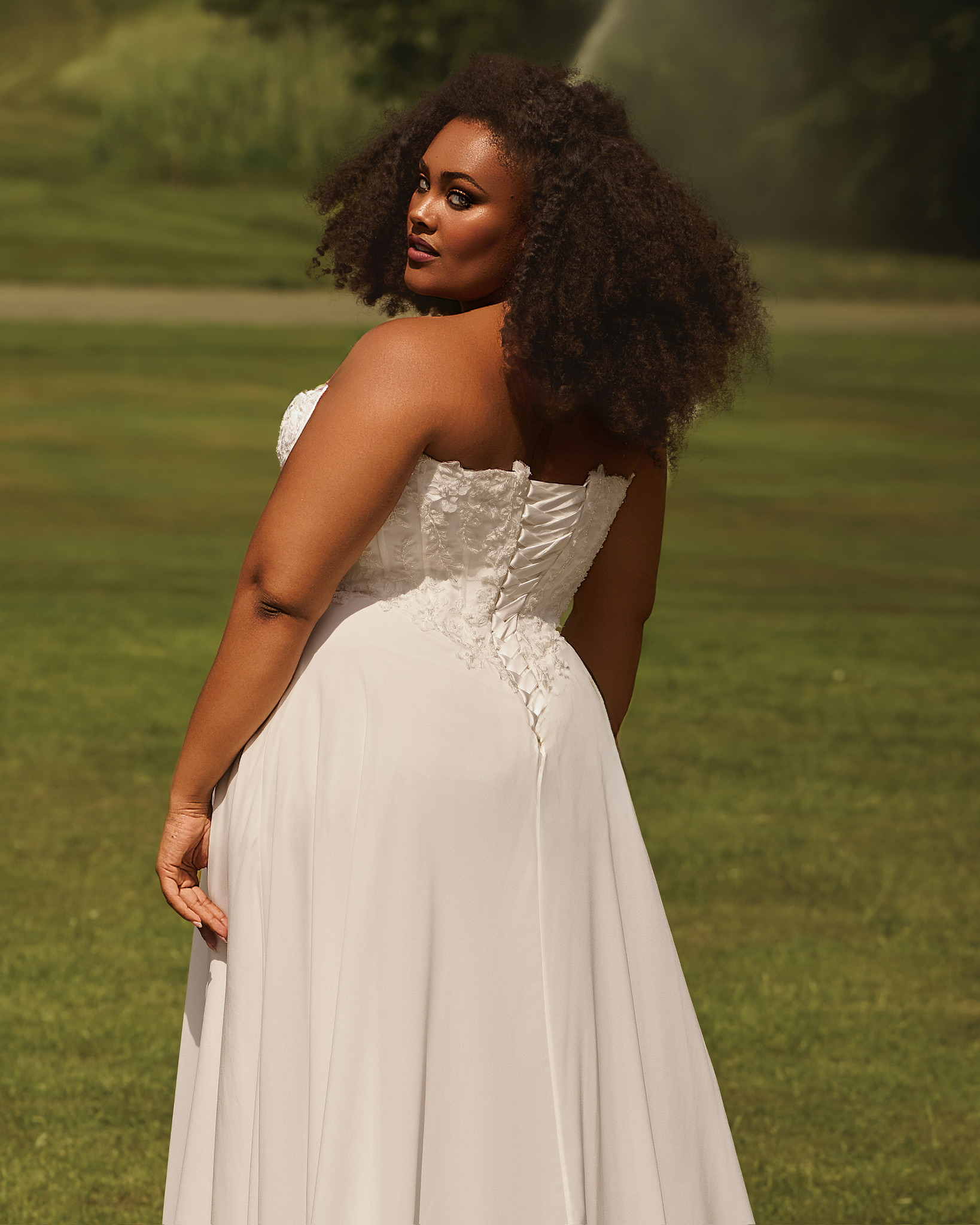 Springtime flowers, adorned with beads and discreet sparkles, feature on the fitted bodice with gently curved neckline and defined corsetry. They continue onto the top of the chiffon skirt.
